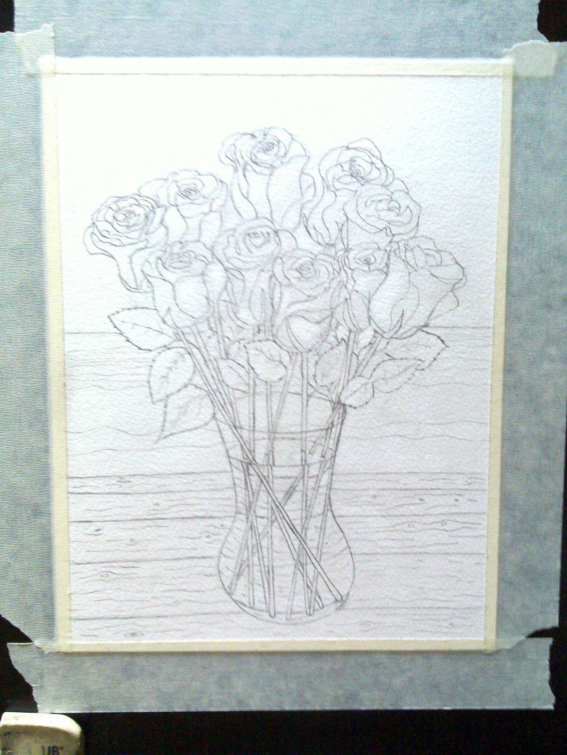 TenRosesOnTableinFrontofLakeDrawingUnfinished