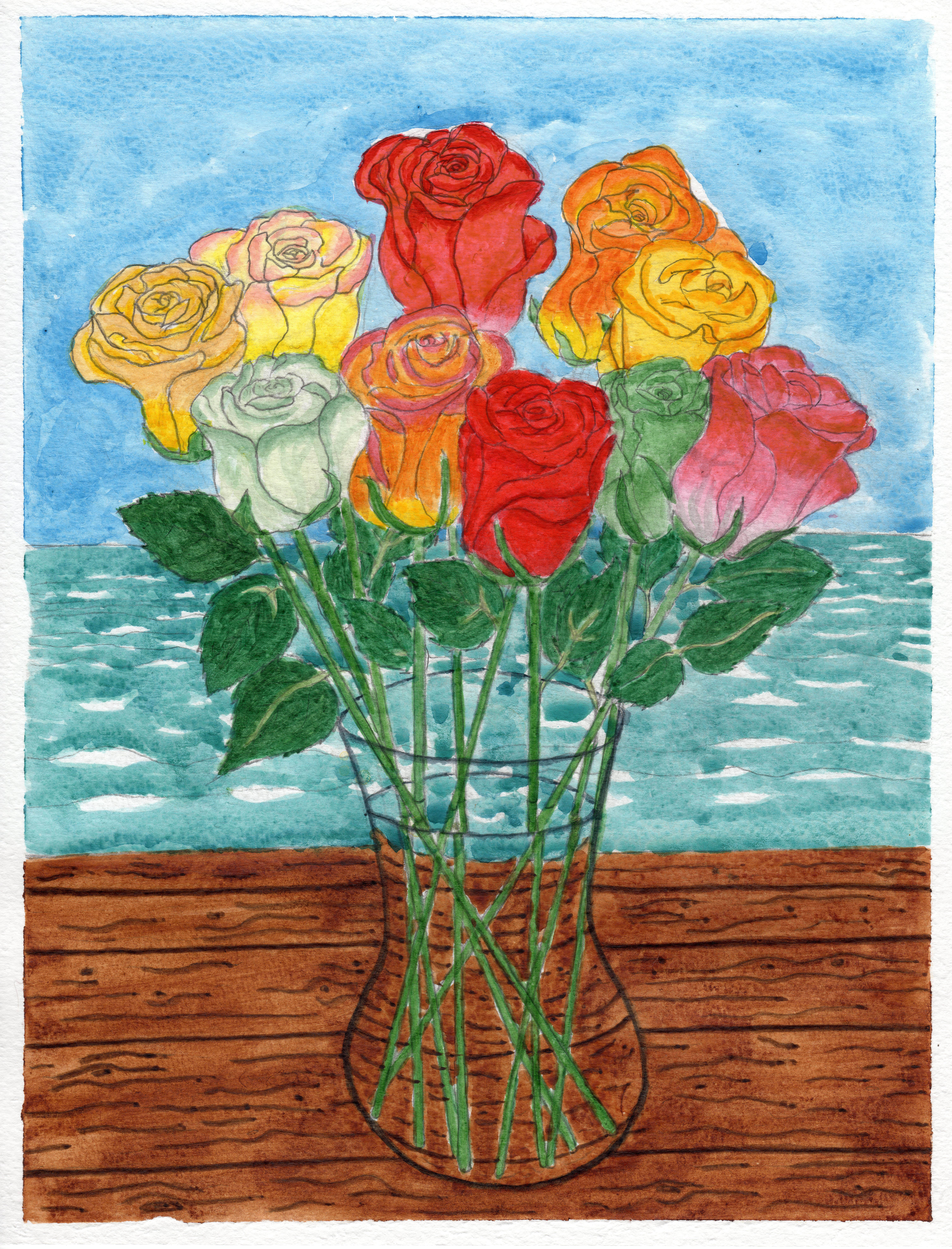 TenRosesOnTableinFrontofLakeDrawingNext, I painted the drawing with watercolor. Here’s a scan of the finished painting: